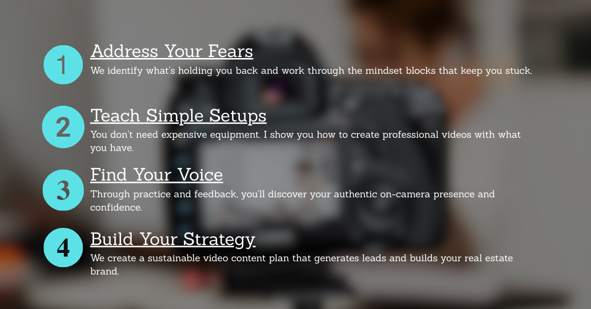 A: Absolutely not. I'll show you how to create professional videos with what you already have - your smartphone, natural lighting, and a simply backdrop. We can always upgrade equipment later, but great content starts with confidence and authenticity.